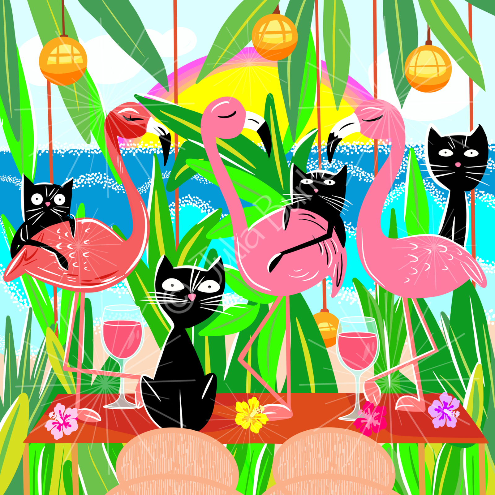 “Cocktails” “Margaritas with Mingos” “Twilight” “Palm Trees” Nostalgia gets a twist in this series of atomic black cats and cheeky flamingos. With bold color palettes, cocktail vibes, and retro charm, these playful scenes channel the cool energy of mid-century modern design.